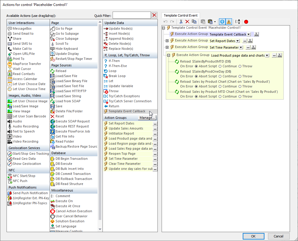 The last action group in the image above is expanded to display the Reload actions that update the Sales by Product report. The first two Reload actions execute database queries, and the last two Reload actions redraw charts based on the query results.