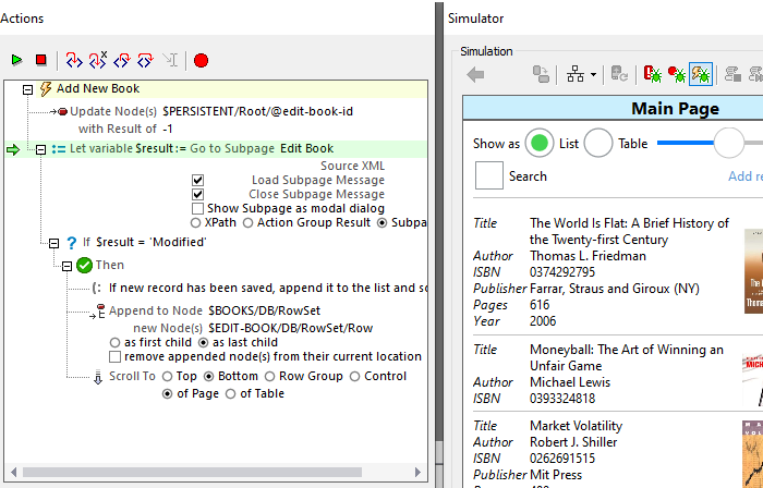 The MobileTogether Debugger runs during app simulation. A new toolbar in the Simulator window lets you enable debugging to stop at the next error, next breakpoint, or next Action during the simulation. Breakpoints can be configured prior to or during a debugging session and can be set on any number of Actions or XPath expressions.