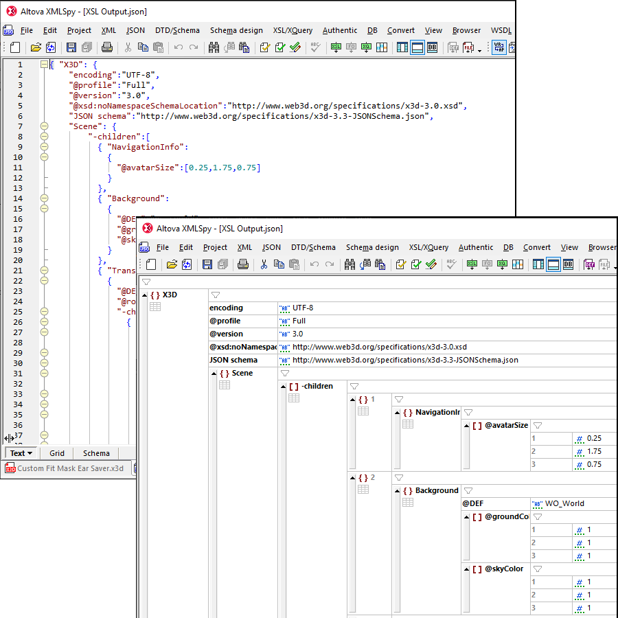 The Web3D Consortium is nearing completion of a standard for storing X3D in JSON format and has released an XSL stylesheet to convert .x3d files to JSON. XMLSpy includes the very fast RaptorXML XSLT 3.0 processor, which you can use with the Web3D XSL stylesheet to try out file conversion.