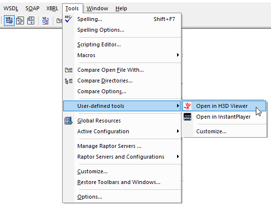 First, we can customize the XMLSpy Tools menu to create a new menu selection to conveniently render 3D images from .x3d files. We installed two X3D players listed on the web3d.org X3D resources page so we can compare results in each. This creates the user-defined menu options here: