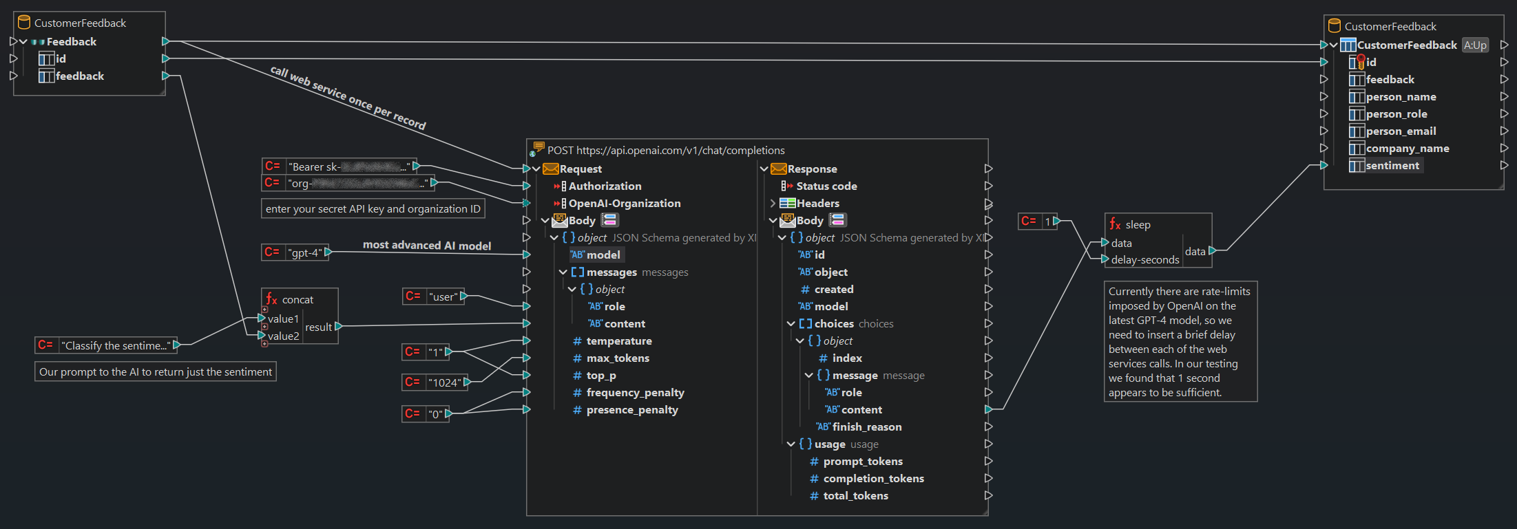 Therefore, we need to add a little sleep(1) function between our calls to the OpenAI web service interface to separate our calls by about 1 second. We can easily do that via the new built-in sleep() function available in MapForce v2024: