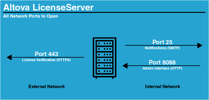 The image below outlines the network ports required by Altova LicenseServer to properly validate files.